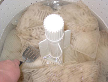Wool is gently washed and released of grease and dirt. Before washing your wool is being shaken in special machines. Washing is done in particular huge machines, giants made of 3 to 5 containers that are filled with washing solution. Washing itself is divided into soaking, washing and rinsing. Soaking has the task of softening dirt and grease and to turn them into soap like mass. After that the washing is done. Rinsing is done in special container until the water is clean.